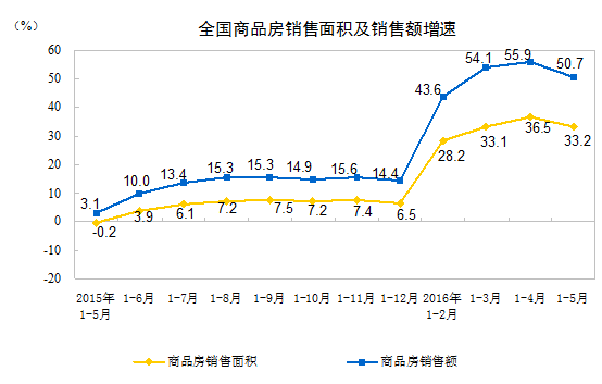 1-5月份,全国房地产开发投资34564亿元,同比增长7.0%,增速比1-4月份回落0.2个百分点,比上年同期加快1.9个百分点。其中,住宅投资增长6.8%。房屋新开工面积59522万平方米,同比增长18.3%,其中住宅新开工面积增长16.2%。全国商品房销售面积47954万平方米,同比增长33.2%,其中住宅销售面积增长34.2%。全国商品房销售额36775亿元,同比增长50.7%,其中住宅销售额增长53.4%。房地产开发企业土地购置面积7196万平方米,同比下降5.9%。5月末,全国商品房待售面积72169万平方米,比4月末减少521万平方米。1-5月份,房地产开发企业到位资金53681亿元,同比增长16.8%。