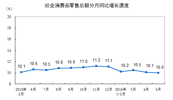 5月份,社会消费品零售总额26611亿元,同比名义增长10.0%,增速比上月和上年同期均回落0.1个百分点(扣除价格因素实际增长9.7%,比上月加快0.4个百分点)。其中,限额以上单位消费品零售额11885亿元,增长6.5%。按经营单位所在地分,城镇消费品零售额22973亿元,同比增长9.9%,乡村消费品零售额3638亿元,增长10.7%。按消费类型分,餐饮收入2878亿元,同比增长10.9%,商品零售23733亿元,增长9.9%,其中限额以上单位商品零售11165亿元,增长6.5%。从环比看,5月份社会消费品零售总额比上月增长0.76%。1-5月份,社会消费品零售总额同比增长10.2%。