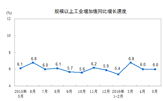 5月份,全国规模以上工业增加值按可比价格计算同比增长6.0%,增速与上月持平,比上年同期回落0.1个百分点。分经济类型看,国有控股企业增加值同比下降0.5%,集体企业增长3.3%,股份制企业增长7.2%,外商及港澳台商投资企业增长3.1%。分三大门类看,采矿业增加值同比下降2.3%,制造业增长7.2%,电力、热力、燃气及水生产和供应业增长2.4%。工业结构继续优化,高技术产业和装备制造业增加值同比分别增长11.5%和8.5%,增速分别比上月加快1.8和0.6个百分点,分别比规模以上工业快5.5和2.5个百分点。规模以上工业企业产销率达到97.3%。从环比看,5月份规模以上工业增加值比上月增长0.45%。1-5月份,规模以上工业增加值同比增长5.9%。