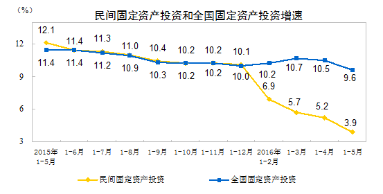 1-5月份,全国固定资产投资(不含农户)187671亿元,同比增长9.6%,增速比1-4月份回落0.9个百分点。其中,国有控股投资64733亿元,增长23.3%;民间投资116384亿元,增长3.9%,占全部投资的比重为62.0%。分产业看,第一产业投资5081亿元,同比增长20.6%;第二产业投资74882亿元,增长5.8%;第三产业投资107708亿元,增长11.9%。高技术产业投资增长较快,1-5月份同比增长13.6%,比全部投资增速快4.0个百分点。从到位资金情况看,固定资产投资到位资金212521亿元,同比增长7.9%。其中,国家预算资金增长21.4%,国内贷款增长13.7%,自筹资金增长1.0%,利用外资下降18.5%。新开工项目计划总投资178192亿元,同比增长32.2%。从环比看,5月份固定资产投资(不含农户)比上月增长0.49%。