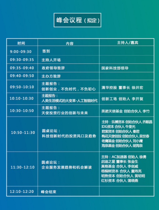 本届峰会设有“创新·未来”主题峰会、首届创业融资交流展、大佬面对面三大板块: